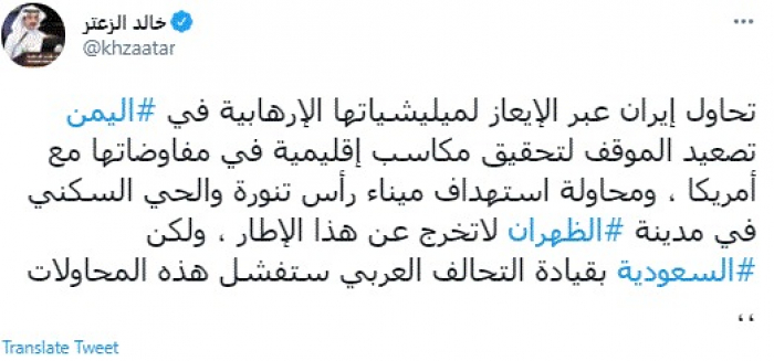 وكتب في تغريدة عبر "تويتر" رصدها "المشهد العربي": "تحاول إيران عبر الإيعاز لمليشياتها الإرهابية في اليمن تصعيد الموقف لتحقيق مكاسب إقليمية في مفاوضاتها مع أمريكا، ومحاولة استهداف ميناء رأس تنورة والحي السكني في مدينة الظهران لا تخرج عن هذا الإطار، ولكن السعودية بقيادة التحالف العربي ستفشل هذه المحاولات".