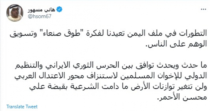 وأضاف: "ما حدث ويحدث توافق بين الحرس الثوري الإيراني والتنظيم الدولي للإخوان المسلمين لاستنزاف محور الاعتدال العربي ولن تتغير توازنات الأرض ما دامت الشرعية بقبضة علي محسن الأحمر".