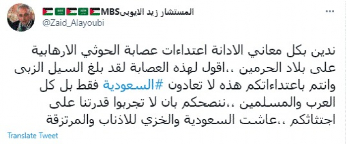 أدان المحامي والمحلل السياسي والاستراتيجي الفلسطيني المستشار زيد الأيوبي، اليوم، الاعتداءات الحوثية الإرهابية على السعودية.