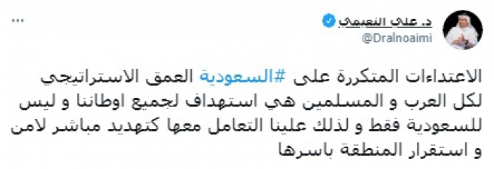 وأشار في تغريدة على حسابه بموقع التدوين المصغر تويتر، اليوم إلى أن: "الاعتداءات المتكررة على السعودية العمق الاستراتيجي لكل العرب والمسلمين هي استهداف لجميع أوطاننا وليس للسعودية فقط".