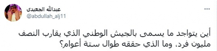 وقال في تغريدة عبر "تويتر" رصدها "المشهد العربي": "أين يتواجد ما يسمى بالجيش الوطني الذي يقارب النصف مليون فرد، وما الذي حققه طوال ستة أعوام".