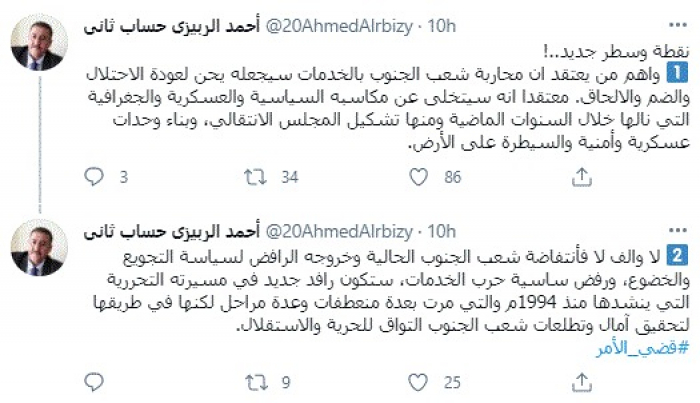 وكتب في تغريدات عبر "تويتر" رصدها "المشهد العربي": "نقطة وسطر جديد! واهم من يعتقد أن محاربة شعب الجنوب بالخدمات سيجعله يحن لعودة الاحتلال والضم والإلحاق. معتقدًا أنه سيتخلى عن مكاسبه السياسية والعسكرية والجغرافية التي نالها خلال السنوات الماضية ومنها تشكيل المجلس الانتقالي، وبناء وحدات عسكرية وأمنية والسيطرة على الأرض".