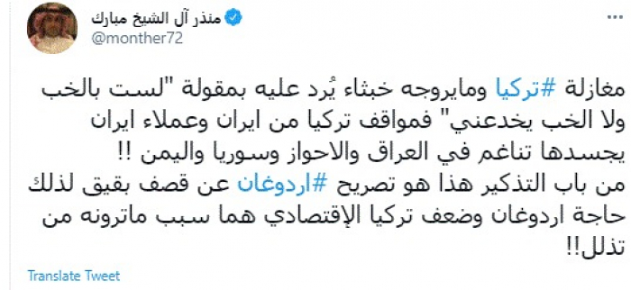 علق المدون السعودي البارز منذر آل الشيخ مبارك، اليوم، على مغازلة تركيا وتودد رموز نظامها لمصر والسعودية، مؤكدًا أنه يوجد تناغم بين تركيا وإيران في العراق وسوريا واليمن.