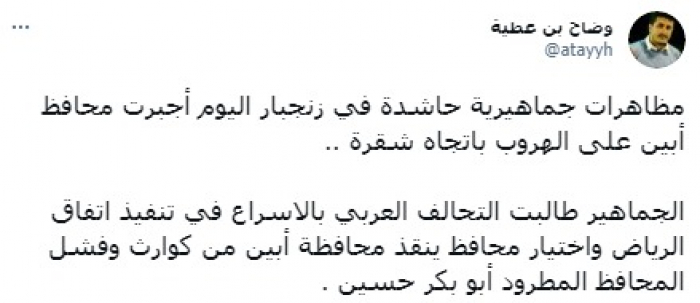وقال في تغريدة على حسابه بموقع التدوين المصغر تويتر، اليوم إن: "مظاهرات جماهيرية حاشدة في زنجبار اليوم أجبرت محافظ أبين على الهروب باتجاه شقرة".