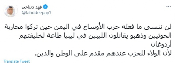 وقال في تغريدة عبر "تويتر" رصدها "المشهد العربي": "لن ننسى ما فعله حزب ... في اليمن حين تركوا محاربة الحوثيين وذهبوا يقاتلون الليبين في ليبيا طاعة لخليفتهم أردوغان".