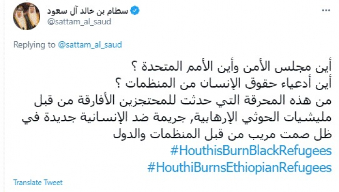 استنكر الأمير السعودي البارز سطام بن خالد آل سعود، اليوم، صمت مجلس الأمن ومنظمات حقوق الإنسان من محرقة المحتجزين الأفارقة التي وقعت في أحد أماكن احتجاز الأفارقة في صنعاء على يد مليشيات الحوثي الإرهابية.
