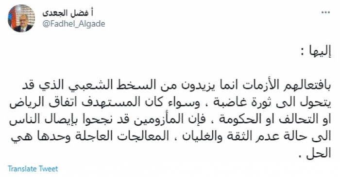 وكتب في تغريدة عبر "تويتر" رصدها "المشهد العربي": "بافتعالهم الأزمات إنما يزيدون من السخط الشعبي الذي قد يتحول إلى ثورة غاضبة، وسواء كان المستهدف اتفاق الرياض أو التحالف أو الحكومة، فإن المأزومين قد نجحوا بإيصال الناس إلى حالة عدم الثقة والغليان، المعالجات العاجلة وحدها هي الحل".