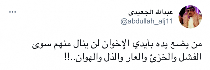 وكتب "الجعيدي" تغريدة عبر حسابه بتويتر، رصدها "المشهد العربي": "من يضع يده بأيدي الإخوان لن ينال منهم سوى الفشل والخزي والعار والذل والهوان".