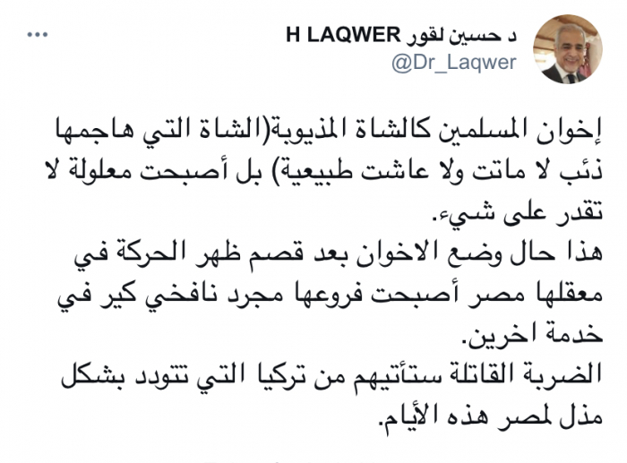 وكتب "لقور" تغريدة عبر حسابه بتويتر، رصدها "المشهد العربي": "إخوان المسلمين كالشاة المذيوبة (الشاة التي هاجمها ذئب لا ماتت ولا عاشت طبيعية) بل أصبحت معلولة لا تقدر على شيء".