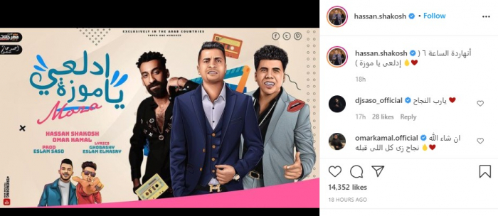 ونشر شاكوش، صورة تجمعه مع كمال وساسو، عبر حسابه الرسمي بموقع إنستجرام، وعلق: "حسن شاكوش، إسلام ساسو، عمر كمال، النهاردة الساعة ٦ إن شاء الله مهرجان (ادلعي يا موزة)".