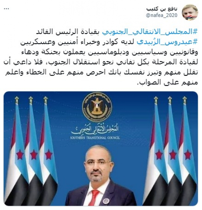 وقال في تغريدة على حسابه بموقع التدوين المصغر تويتر، اليوم إن: "المجلس الانتقالي الجنوبي بقيادة الرئيس القائد عيدروس الزُبيدي لديه كوادر وخبراء أمنيون وعسكريون وقانونيون وسياسيون ودبلوماسيون يعملون بحنكة ودهاء لقيادة المرحلة بكل تفانٍ نحو استقلال الجنوب".