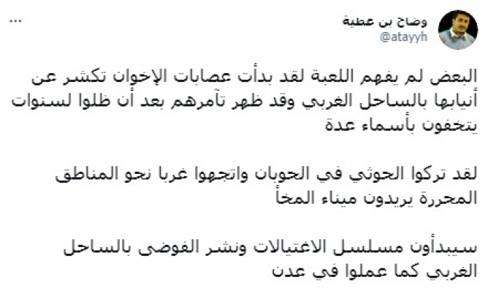 وقال في تغريدة على حسابه بموقع التدوين المصغر تويتر، اليوم إن: "البعض لم يفهم اللعبة، لقد بدأت عصابات الإخوان تكشر عن أنيابها بالساحل الغربي".