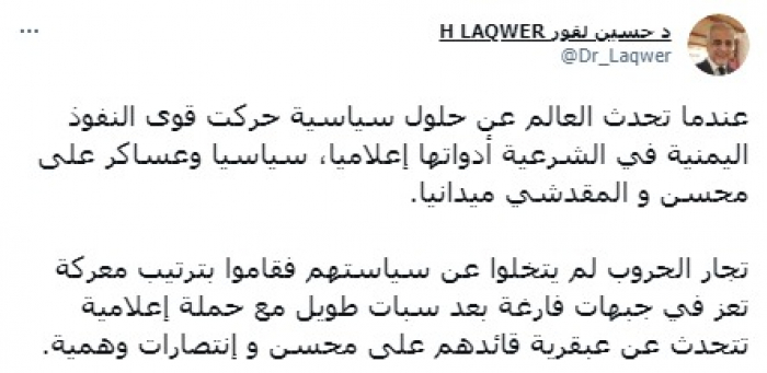 وأوضح في تغريدة على حسابه بموقع التدوين المصغر تويتر، اليوم أنه: "عندما تحدث العالم عن حلول سياسية حركت قوى النفوذ اليمنية في الشرعية أدواتها إعلاميا، سياسيا وعساكر على محسن والمقدشي ميدانيا".