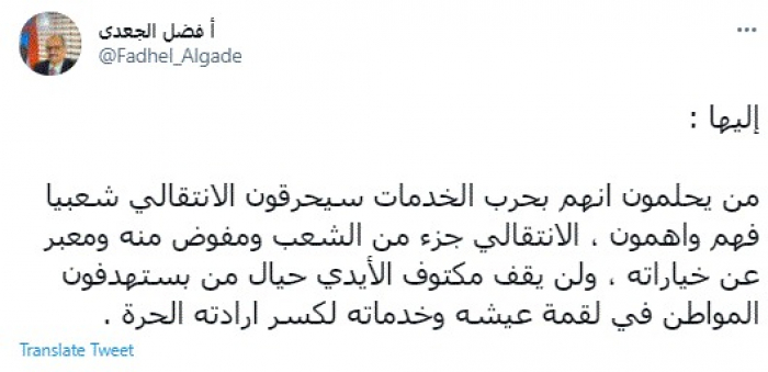 وكتب في تغريدة عبر "تويتر" رصدها "المشهد العربي": "من يحلمون أنهم بحرب الخدمات سيحرقون الانتقالي شعبيًا فهم واهمون، الانتقالي جزء من الشعب ومفوض منه ومعبر عن خياراته، ولن يقف مكتوف الأيدي حيال من يستهدفون المواطن في لقمة عيشه وخدماته لكسر إرادته الحرة".