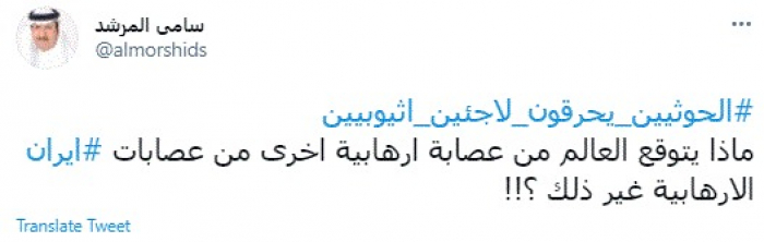 تفاعل المحلل السياسي السعودي سامي المرشد، اليوم، مع هاشتاج "الحوثيين يحرقون لاجئين إثيوبيين".