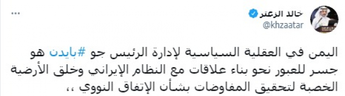وأكد في تغريدة على حسابه بموقع التدوين المصغر تويتر، اليوم أن: "اليمن في العقلية السياسية لإدارة الرئيس جو بايدن هو جسر للعبور نحو بناء علاقات مع النظام الإيراني وخلق الأرضية الخصبة لتحقيق المفاوضات بشأن الاتفاق النووي".