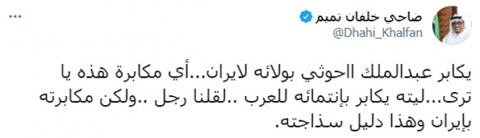 وقال في تغريدة عبر "تويتر" رصدها "المشهد العربي": "يكابر عبدالملك الحوثي بولائه لإيران... أي مكابرة هذه يا ترى... ليته يكابر بانتمائه للعرب.. لقلنا رجل ..ولكن مكابرته بإيران وهذا دليل سذاجته".