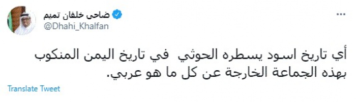 وقال في تغريدة عبر "تويتر" رصدها "المشهد العربي": "أي تاريخ أسود يسطره الحوثي في تاريخ اليمن المنكوب بهذه الجماعة الخارجة عن كل ما هو عربي".