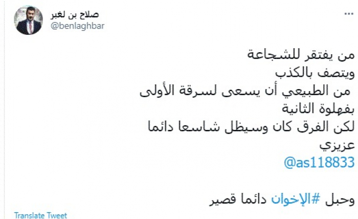 وقال في تغريدة عبر "تويتر" رصدها "المشهد العربي": "من يفتقر للشجاعة ويتصف بالكذب من الطبيعي أن يسعى لسرقة الأولى بفهلوة الثانية لكن الفرق كان وسيظل شاسعًا دائمًا، وحبل الإخوان دائمًا قصير".