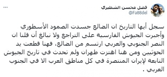 وأوضح في تغريدة على حسابه بموقع التدوين المصغر تويتر، اليوم أنه: "سجل أيها التاريخ أن الضالع جسدت الصمود الأسطوري وأجبرت الجيوش الفارسية على التراجع"، مضيفا: "ولا نبالغ إن قلنا أن النصر الجنوبي والعربي ارتسم من الضالع".