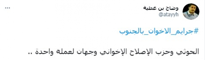 وشارك في تغريدة على حسابه بموقع التدوين المصغر تويتر، اليوم بهاشتاج: "جرائم الإخوان بالجنوب".