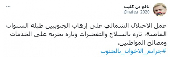 وقال في تغريدة على حسابه بموقع التدوين المصغر تويتر، اليوم إنه: "عمل الاحتلال الشمالي على إرهاب الجنوبيين طيلة السنوات الماضية، تارة بالسلاح والتفجيرات وتارة بحربه على الخدمات ومصالح المواطنين"، مختتما بهاشتاج: "جرايم الإخوان بالجنوب".