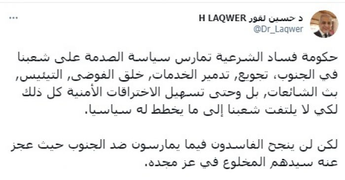 وحذر في تغريدة على حسابه بموقع التدوين المصغر تويتر، اليوم من أن: "حكومة فساد الشرعية تمارس سياسة الصدمة على شعبنا في الجنوب، تجويع، تدمير الخدمات، خلق الفوضى، التيئيس، بث الشائعات، بل وحتى تسهيل الاختراقات الأمنية".