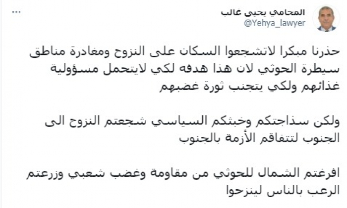 أكد الناشط السياسي يحيى غالب أن تشجيع سكان الشمال على النزوح لتجنيب مليشيا الحوثي الإرهابية خطر ثورتهم، ومفاقمة الأزمة في الجنوب.