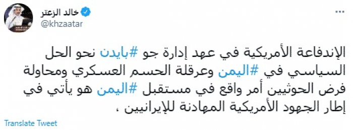وكتب في تغريدة عبر "تويتر" رصدها "المشهد العربي": "الاندفاعة الأمريكية في عهد إدارة جو بايدن نحو الحل السياسي في اليمن وعرقلة الحسم العسكري ومحاولة فرض الحوثيين أمر واقع في مستقبل اليمن هو يأتي في إطار الجهود الأمريكية المهادنة للإيرانيين".