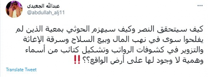 وقال في تغريدة عبر "تويتر" رصدها "المشهد العربي": "كيف سيتحقق النصر وكيف سيهزم الحوثي بمعية الذين لم يفلحوا سوى في نهب المال وبيع السلاح وسرقة الإغاثة والتزوير في كشوفات الرواتب وتشكيل كتائب من أسماء وهمية لا وجود لها على أرض الواقع؟".