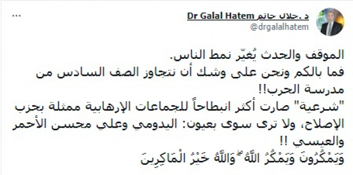 وأشار إلى أن: "شرعية" صارت أكثر انبطاحا للجماعات الإرهابية ممثلة بحزب الإصلاح، ولا ترى سوى بعيون: اليدومي وعلي محسن الأحمر والعيسي!!"، مختتما بالآية القرآنية: "وَيَمْكُرُونَ وَيَمْكُرُ اللَّهُ ۖ وَاللَّهُ خَيْرُ الْمَاكِرِينَ".
