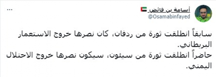 وقال في تغريدة على حسابه بموقع التدوين المصغر تويتر، اليوم إنه: "سابقا انطلقت ثورة من ردفان، كان نصرها خروج الاستعمار البريطاني".