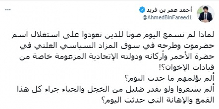 وتساءل في تغريدة على حسابه بموقع التدوين المصغر تويتر، اليوم: "لماذا لم نسمع اليوم صوتا للذين تعودوا على استغلال اسم حضرموت وطرحه في سوق المزاد السياسي العلني في حضرة الأحمر وأركانه ودولته الاتحادية المزعومة خاصة من قيادات الإخوان؟!".