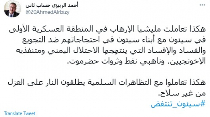 وقال في تغريدة عبر "تويتر" رصدها "المشهد العربي": "هكذا تعاملت مليشيا الإرهاب في المنطقة العسكرية الأولى في سيئون مع أبناء سيئون في احتجاجاتهم ضد التجويع والفساد والإفساد التي ينتهجها الاحتلال اليمني ومتنفذيه الإخونجيين، وناهبي نفط وثروات حضرموت".