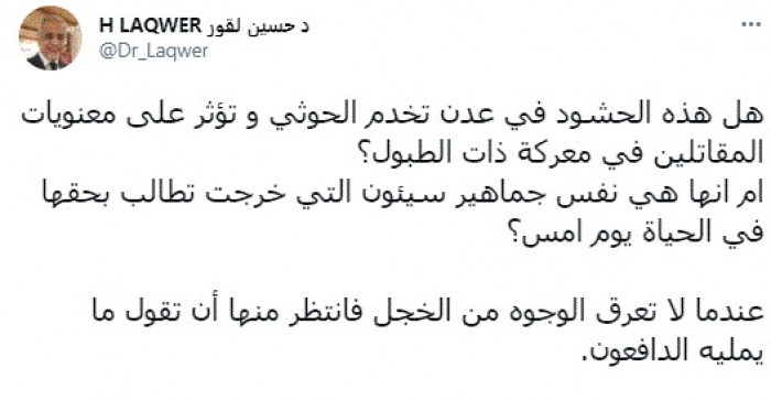 وقال في تغريدة عبر "تويتر" رصدها "المشهد العربي": "هل هذه الحشود في عدن تخدم الحوثي و تؤثر على معنويات المقاتلين في معركة ذات الطبول؟ أم أنها هي نفس جماهير سيئون التي خرجت تطالب بحقها في الحياة يوم أمس؟".