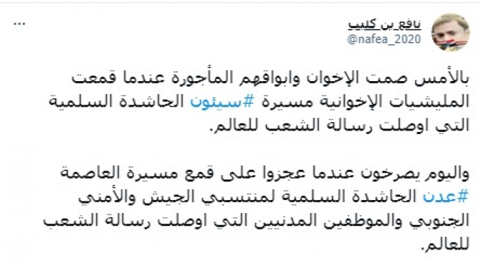 استنكر الناشط السياسي نافع بن كليب سكوت أبواق تنظيم الإخوان الإرهابي على قمع المتظاهرين في سيئون، وتحريضهم على قمع المتظاهرين في عدن، مؤكدا أن التظاهرات السلمية أبلغت رسالة الجنوبيين إلى العالم.