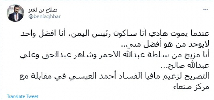وقال في تغريدة عبر "تويتر" رصدها "المشهد العربي": "عندما يموت هادي أنا ساكون رئيس اليمن، أنا أفضل واحد لا يوجد من هو أفضل مني.. أنا مزيج من سلطة عبدالله الاحمر وشاهر عبدالحق وعلي عبدالله صالح... التصريح لزعيم مافيا الفساد أحمد العيسي في مقابلة مع مركز صنعاء".