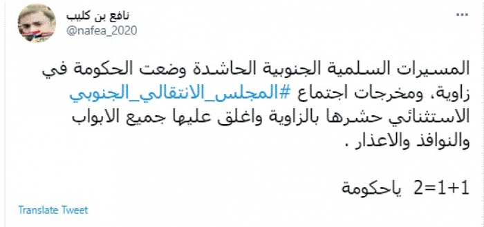 وكتب في تغريدة عبر "تويتر" رصدها "المشهد العربي": "المسيرات السلمية الجنوبية الحاشدة وضعت الحكومة في زاوية، ومخرجات اجتماع المجلس الانتقالي الجنوبي الاستثنائي حشرها بالزاوية وأغلق عليها جميع الابواب والنوافذ والأعذار".