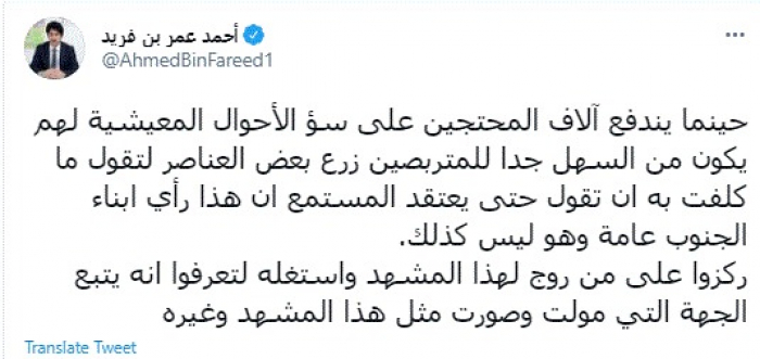 وقال في تغريدة عبر "تويتر" رصدها "المشهد العربي": "حينما يندفع آلاف المحتجين على سوء الأحوال المعيشية لهم يكون من السهل جدا للمتربصين زرع بعض العناصر لتقول ما كلفت به أن تقول حتى يعتقد المستمع أن هذا رأي أبناء الجنوب عامة وهو ليس كذلك".