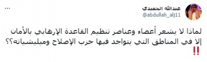 وتساءل في تغريدة على حسابه بموقع التدوين المصغر تويتر، اليوم قائلا: "لماذا لا يشعر أعضاء وعناصر تنظيم القاعدة الإرهابي بالأمان إلا في المناطق التي يتواجد فيها حزب الإصلاح ومليشياته؟؟".