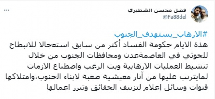 وأوضح في تغريدة على حسابه بموقع التدوين المصغر تويتر، اليوم أن: "الإرهاب يستهدف الجنوب".
