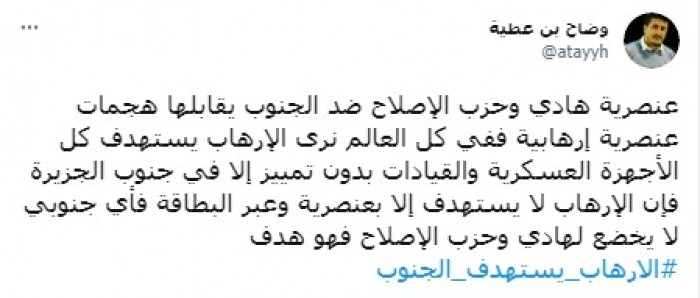وشدد على أن: "أي جنوبي لا يخضع لهادي وحزب الإصلاح فهو هدف"، مختتما بهاشتاج: "الإرهاب يستهدف الجنوب".
