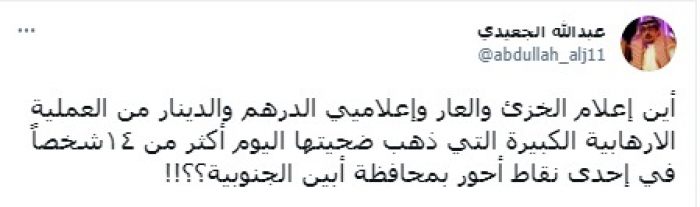 وتساءل في تغريدة على حسابه بموقع التدوين المصغر تويتر، اليوم: "أين إعلام الخزي والعار وإعلاميو الدرهم والدينار من العملية الإرهابية الكبيرة التي ذهب ضحيتها اليوم أكثر من 14 شخصا في إحدى نقاط أحور بمحافظة أبين الجنوبية؟؟!!".