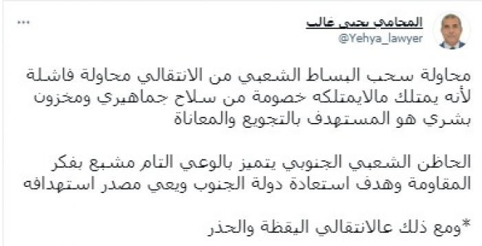 وأكد في تغريدة على حسابه بموقع التدوين المصغر تويتر، اليوم أن: "محاولة سحب البساط الشعبي من الانتقالي محاولة فاشلة لأنه يمتلك ما لا يمتلكه خصومة من سلاح جماهيري ومخزون بشري هو المستهدف بالتجويع والمعاناة".
