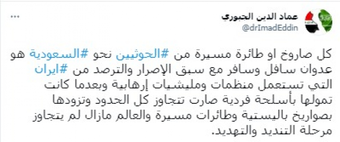 أكد المحلل السياسي العراقي عمادالدين الجبوري، أن كل عدوان لمليشيا الحوثي الإرهابية على أراضي المملكة، يعد اعتداء سافرا لنظام ملالي طهران.