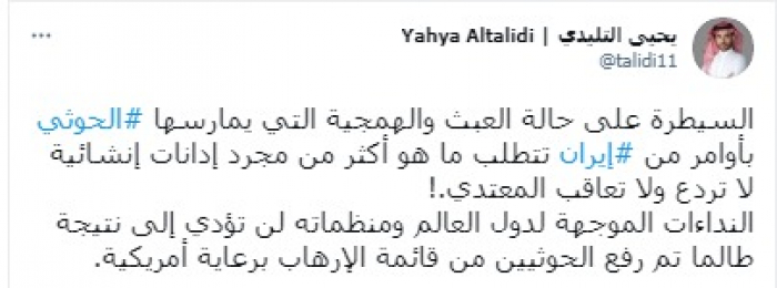 واعتبر في تغريدة على حسابه بموقع التدوين المصغر تويتر، اليوم أن: "السيطرة على حالة العبث والهمجية التي يمارسها الحوثي بأوامر من إيران تتطلب ما هو أكثر من مجرد إدانات إنشائية لا تردع ولا تعاقب المعتدي!".