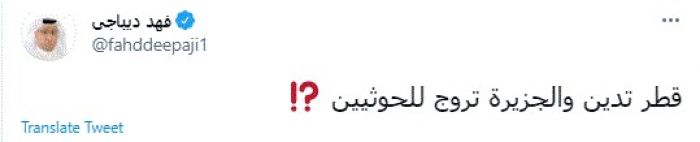 وقال في تغريدة عبر "تويتر" رصدها "المشهد العربي": "قطر تدين والجزيرة تروج للحوثيين".