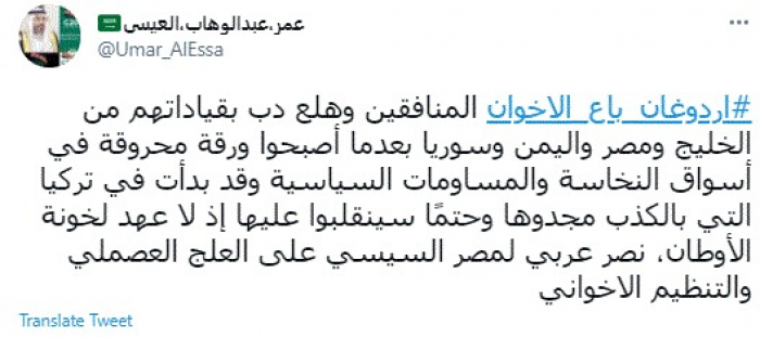 وقال في تغريدة عبر "تويتر" رصدها "المشهد العربي": "أردوغان باع الإخوان المنافقين وهلع دب بقياداتهم من الخليج ومصر واليمن وسوريا بعدما أصبحوا ورقة محروقة في أسواق النخاسة والمساومات السياسية وقد بدأت في تركيا التي بالكذب مجدوها وحتمًا سينقلبوا عليها إذ لا عهد لخونة الأوطان، نصر عربي لمصر السيسي على .... العصملي والتنظيم الإخواني".