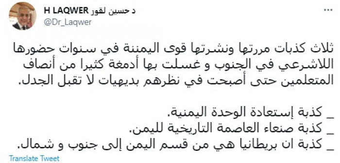 وكتب في تغريدة عبر "تويتر" رصدها "المشهد العربي": "ثلاث كذبات مررتها ونشرتها قوى اليمننة في سنوات حضورها اللاشرعي في الجنوب وغسلت بها أدمغة كثيرًا من أنصاف المتعلمين حتى أصبحت في نظرهم بديهيات لا تقبل الجدل".
