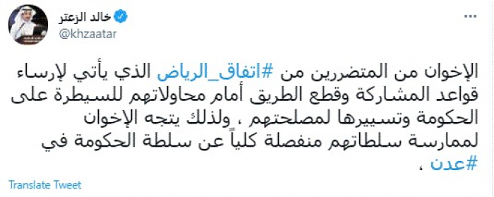 وكتب في تغريدة عبر "تويتر" رصدها "المشهد العربي": "الإخوان من المتضررين من اتفاق الرياض الذي يأتي لإرساء قواعد المشاركة وقطع الطريق أمام محاولاتهم للسيطرة على الحكومة وتسييرها لمصلحتهم، ولذلك يتجه الإخوان لممارسة سلطاتهم منفصلة كليًا عن سلطة الحكومة في عدن".